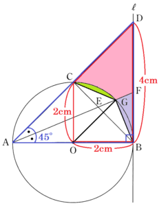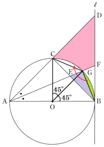 補助線 \( BG,CG,OC,OG \) をひくと,斜線部分の面積は,ピンク \( + \) 紫 \( + \) 黄緑 と考えることができます。